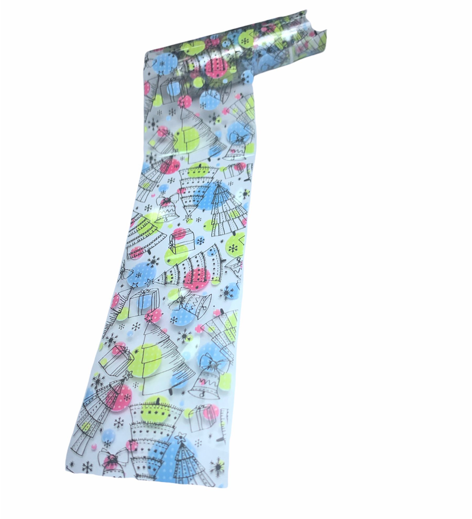 Questo foil con base trasparente, con stampe natalizie alberi, campane e pacchi con cerchi colorati, blu verde e rosa, renderà le vostre unghie uniche e particolari, è facile da usare .
