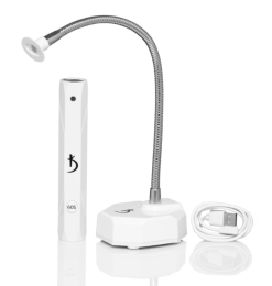 Il dispositivo innovativo ha dimensioni ridotte e una forma rettangolare ben pensata. Il principale vantaggio della lampada è la batteria integrata. La batteria può essere ricaricata con un cavo USB o collegata a una power bank. Premendo il pulsante in silicone sulla parte anteriore dello strumento si imposta automaticamente un timer di 1 minuto per la polimerizzazione intermedia. Il riflettore in alluminio con una ciotola a LED, previsto nel progetto, fissa uniformemente i materiali utilizzati ed è usato per comodità nel lavorare con dual form.