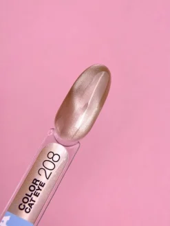 Color Cat Eye №208  è uno smalto gel perfettamente pigmentato che può essere applicato in uno o due strati sottili. Non lascia striature durante l’applicazione, si autolivella facilmente e ha una consistenza medio-densa. Il prodotto contiene minuscole particelle metalliche che reagiscono al magnete, muovendosi nello strato non polimerizzato del rivestimento per creare un magico effetto riflettente nel design.