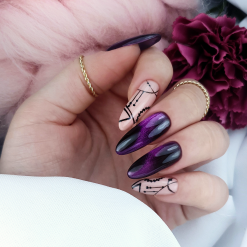 Applicare il colore selezionato di vernice ibrida magnetica sulle unghie verniciate e tenere premuto il bastoncino magnetico per 2-3 secondi. Crea la tua decorazione preferita. Dopo aver ottenuto un effetto soddisfacente, polimerizzare in lampada UV/LED.