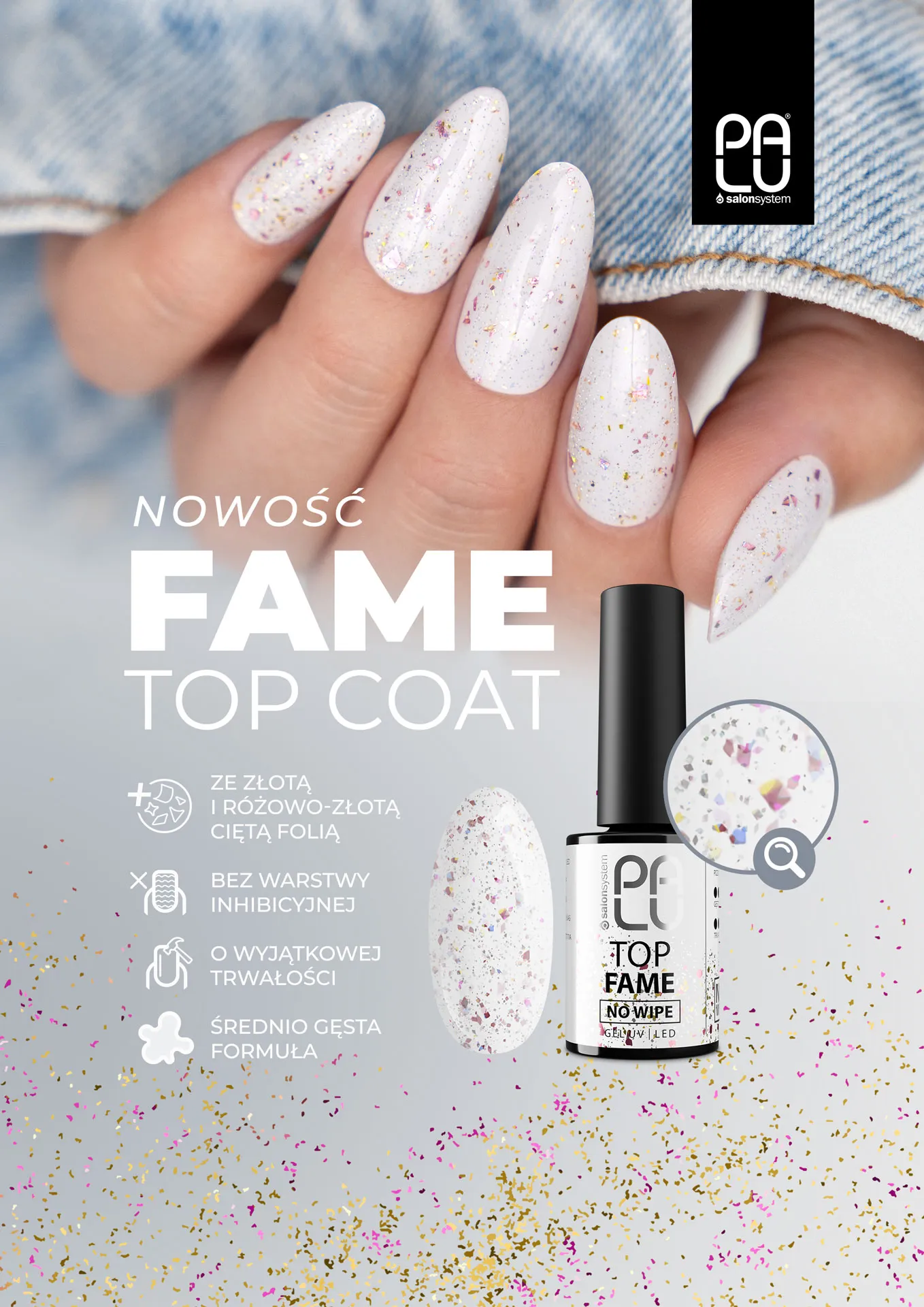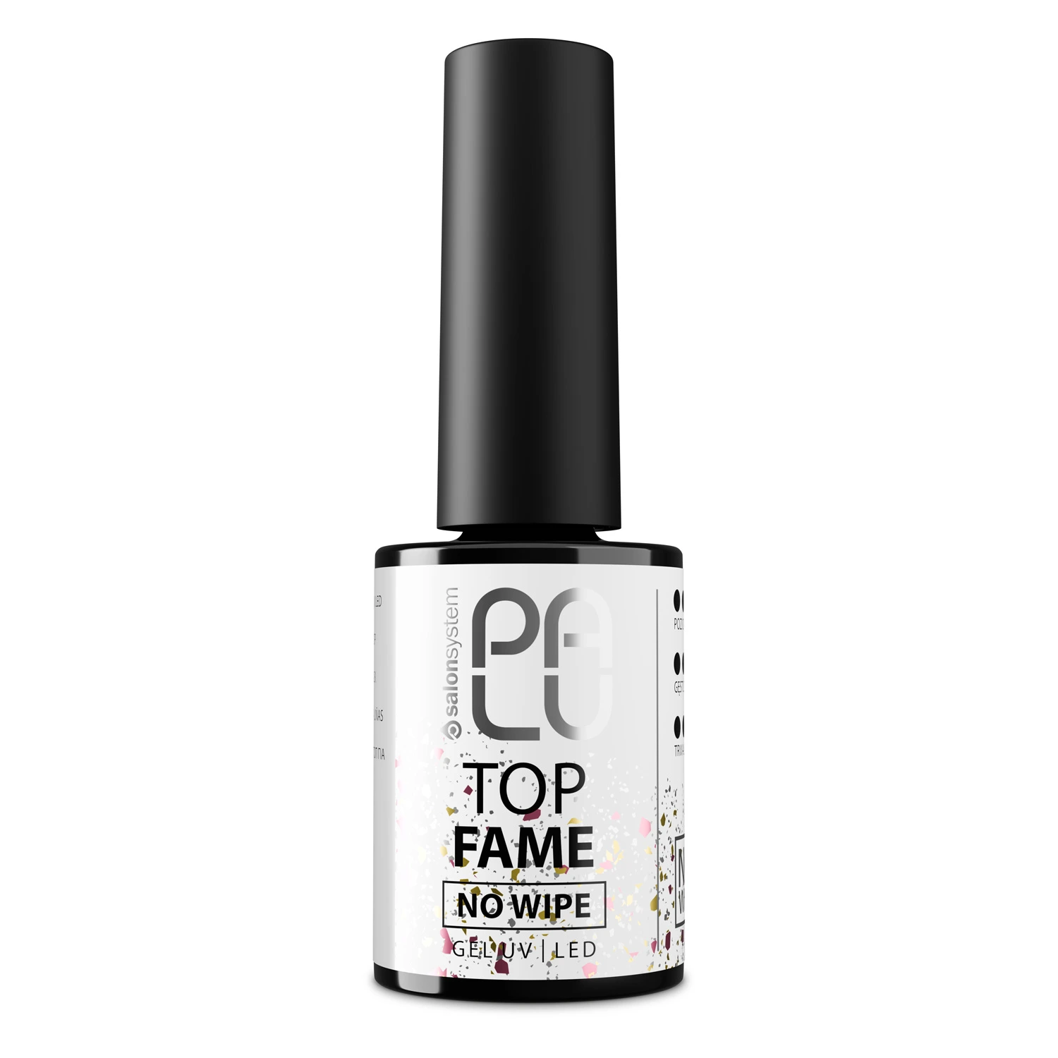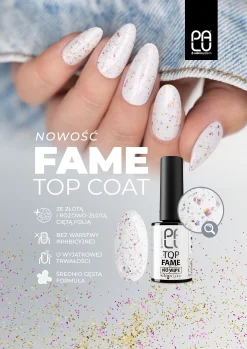 Top Fame No Wipe รจ un top trasparente con particelle di flakes nei toni dell’oro e dell’oro rosa, che creano uno spettacolare effetto gioiello. Estremamente elegante e femminile, espone sottilmente il colore di base e i pezzi di carta stagnola incassati catturano la luce, creando riflessi come petali di rosa illuminati dallo champagne. Una scelta perfetta per abiti romantici, matrimoni, serate o semplicemente quando vuoi sentirti speciale.
